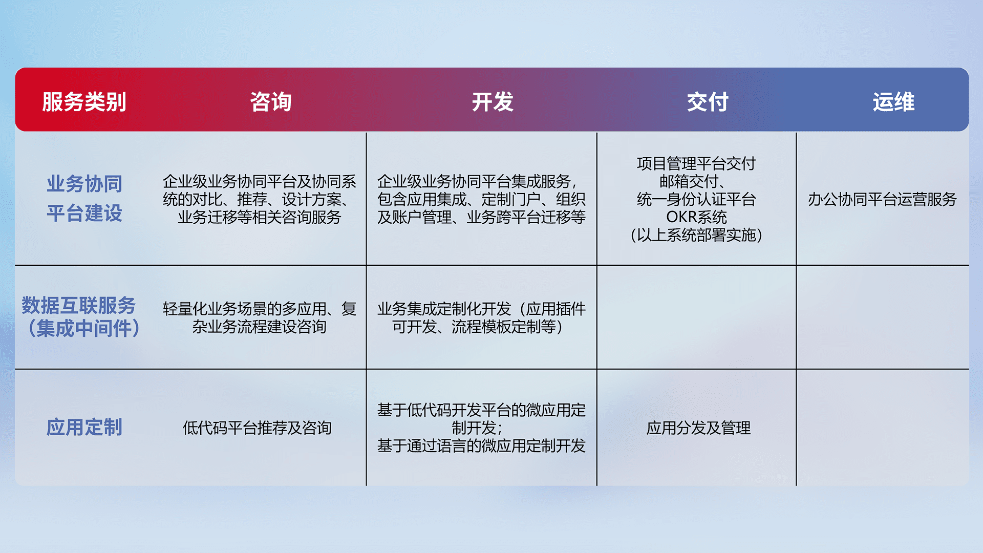 针对钉钉、、、企微、、、IDaas等平台级产品提供产品的规划、、、方案、、交付、、定制化开发等服务,,实现如统一协同办公、、智能客户服务、、、混合会议管理、、智能数据查询、、、等业务场景,,实现数字化转型。。